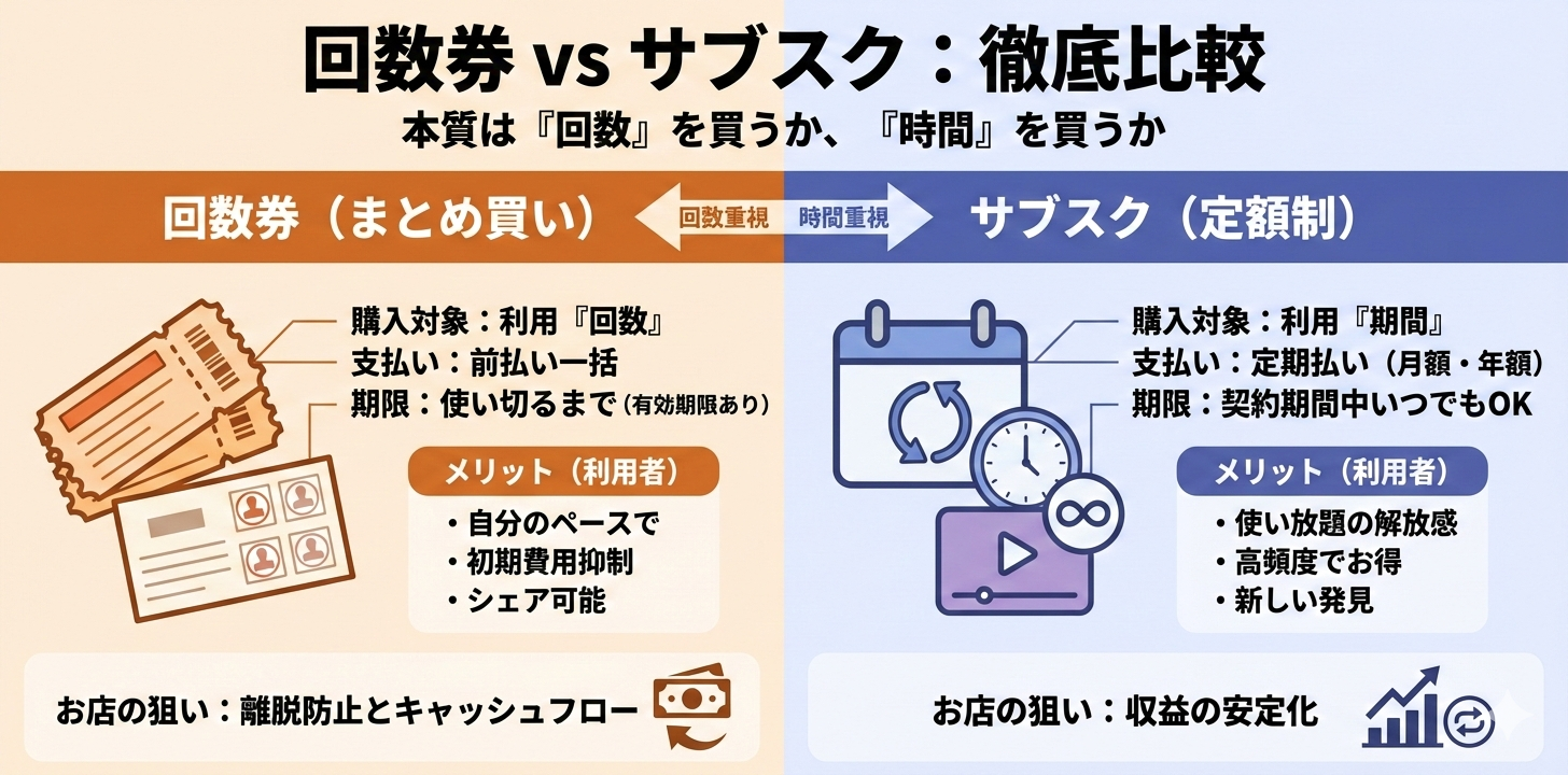 | 比較項目 | 回数券(まとめ買い) | サブスク(定額制) |